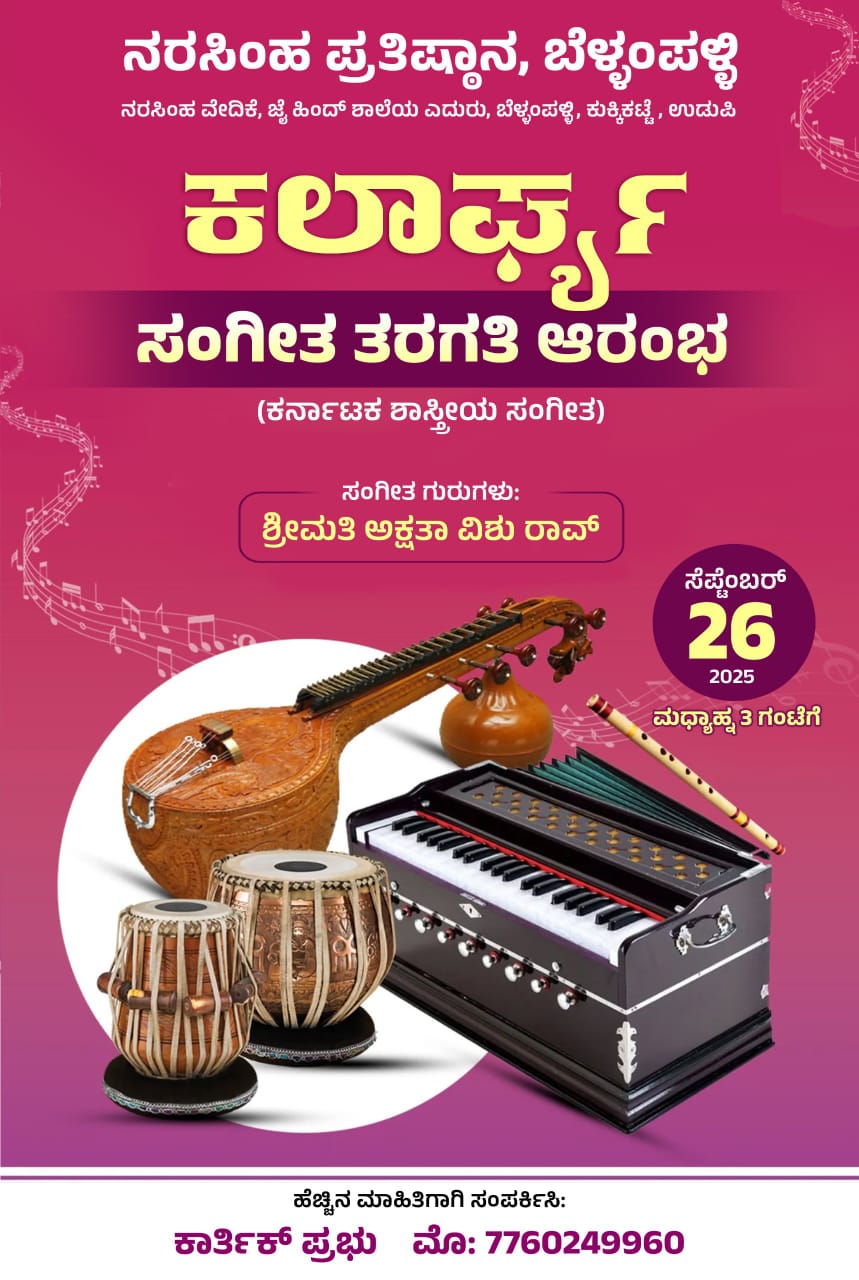 ಉಡುಪಿ:ಸೆ.26 ರಂದು ಮಧ್ಯಾಹ್ನ 3 ಗಂಟೆಗೆ ಸಂಗೀತ ಗುರುಗಳಾದ ಶ್ರೀಮತಿ ಅಕ್ಷತಾ ವಿಶು ರಾವ್ ಅವರ ಕಲಾರ್ಘ್ಯ ಸಂಗೀತ ತರಗತಿ ಆರಂಭವಾಗಲಿದೆ. (ಕರ್ನಾಟಕ ಶಾಸ್ತ್ರೀಯ ಸಂಗೀತ) ಇದು ನರಸಿಂಹ ಪ್ರತಿಷ್ಠಾನ, ಬೆಳ್ಳಂಪಳ್ಳಿ ನರಸಿಂಹ ವೇದಿಕೆ, ಜೈ ಹಿಂದ್ ಶಾಲೆಯ ಎದುರು, ಬೆಳ್ಳಂಪಳ್ಳಿ, ಕುಕ್ಕಿಕಟ್ಟೆ, ಉಡುಪಿ ಇಲ್ಲಿ ನಡೆಯಲಿದೆ.