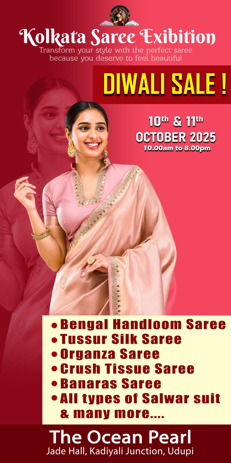 ಉಡುಪಿ:ಕೋಲ್ಕತ್ತಾ ಸೀರೆ ಪ್ರದರ್ಶನ ಹಾಗೂ ದೀಪಾವಳಿ ಮಾರಾಟವು ಬೆಳಿಗ್ಗೆ 10.00 ರಿಂದ ರಾತ್ರಿ 8.00 ರವರೆಗೆ ದಿ ಓಷನ್ ಪರ್ಲ್ ಜೇಡ್ ಹಾಲ್, ಕಡಿಯಾಳಿ ಜಂಕ್ಷನ್, ಉಡುಪಿ ಇಲ್ಲಿ ನಡೆಯಲಿದ್ದು, ನಿಮ್ಮ ಶೈಲಿಯನ್ನು ಪರಿಪೂರ್ಣ ಸೀರೆಯೊಂದಿಗೆ ಪರಿವರ್ತಿಸಿ. ಇಲ್ಲಿ ಅನೇಕ ವಿಧದ ಸೀರೆಗಳು ಎಲ್ಲಾ ದರದಲ್ಲೂ ಲಭ್ಯವಿದೆ. ದೀಪಾವಳಿ ಪ್ರಯುಕ್ತ ಎಲ್ಲಾ ವಿಧದ ಉತ್ಪನ್ನಗಳನ್ನು ವಿಶೇಷ ದರದಲ್ಲಿ ಮಾರಾಟ ಮಾಡಲಾಗುವುದು.