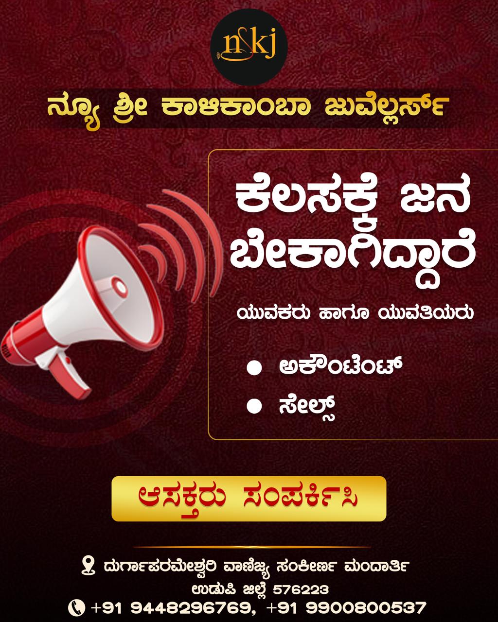 ಉಡುಪಿ:ಮಂದಾರ್ತಿಯ ನ್ಯೂ ಶ್ರೀ ಕಾಳಿಕಾಂಬಾ ಜುವೆಲ್ಲರ್ಸ್ ನಲ್ಲಿ ಕೆಲಸಕ್ಕೆ ಯುವಕರು ಹಾಗೂ ಯುವತಿಯರು ಬೇಕಾಗಿದ್ದಾರೆ.