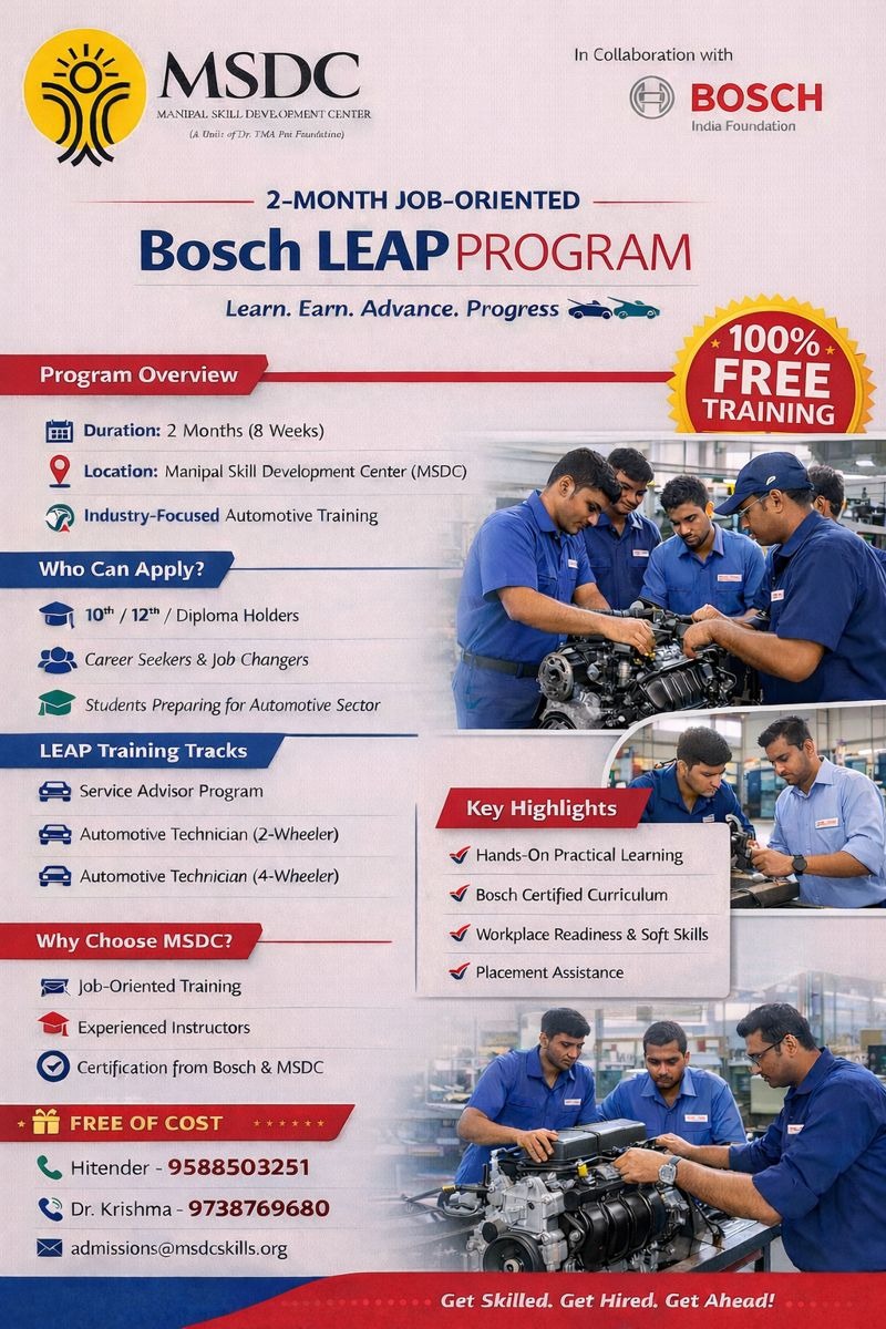 ಮಣಿಪಾಲ: ಮಣಿಪಾಲ ಕೌಶಲ್ಯ ಅಭಿವೃದ್ಧಿ ಕೇಂದ್ರ (ಡಾ. ಟಿ.ಎಂ.ಎ. ಪೈ ಫೌಂಡೇಶನ್ನ ಘಟಕ)MSDC ಯು BOSCH ಇಂಡಿಯಾ ಫೌಂಡೇಶನ್ ಸಹಯೋಗದಲ್ಲಿ 2 ತಿಂಗಳ ಉದ್ಯೋಗಾಧಾರಿತ ಕೋರ್ಸ್ ಬೋಷ್ LEAP ನ್ನು ಆರಂಭಿಸಿದೆ. ಕಲಿ, ಸಂಪಾದಿಸು, ಮುಂದುವರಿ, ಪ್ರಗತಿ ಸಾಧಿಸು, ಎನ್ನುವ ಘೋಷವಾಕ್ಯದೊಂದಿಗೆ ಈ ಕೋರ್ಸ್ ಗಳು ಕೌಶಲ್ಯಗಳನ್ನು ಕಲಿಸಲಿದೆ. 100% ಉಚಿತ ತರಬೇತಿ ಇದಾಗಿದ್ದು ಮಣಿಪಾಲ್ ಕೌಶಲ್ಯ ಅಭಿವೃದ್ಧಿ ಕೇಂದ್ರ (MSDC)ದಲ್ಲಿ ನಡೆಯಲಿದೆ.