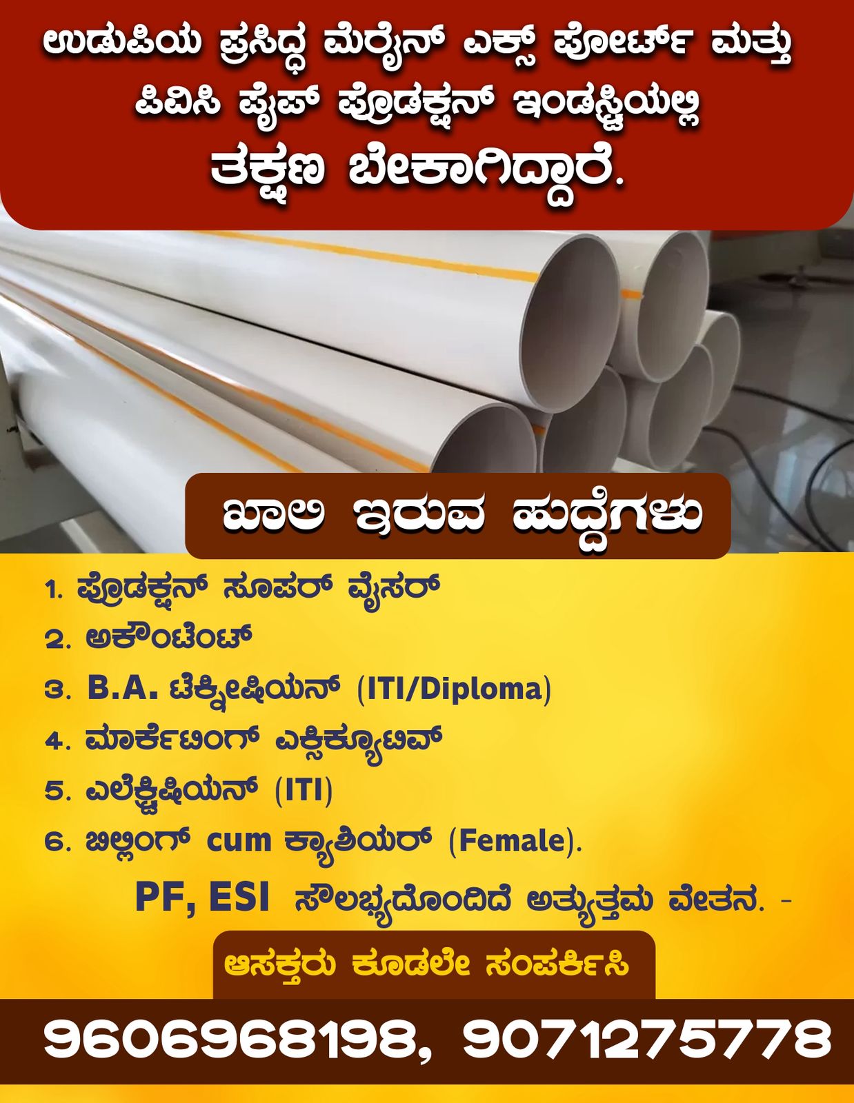 ಉಡುಪಿ:ಉಡುಪಿಯ ಪ್ರಸಿದ್ಧಮರೈ ಎಕ್ಸ್ಪೋರ್ಟ್ ಮತ್ತು ಪಿ ವಿ ಸಿ ಟೈಪ್ ಪ್ರೊಡಕ್ಷನ್ ಇಂಡಸ್ಟ್ರಿಯಲ್ಲಿ ತಕ್ಷಣ ಬೇಕಾಗಿದ್ದಾರೆ.