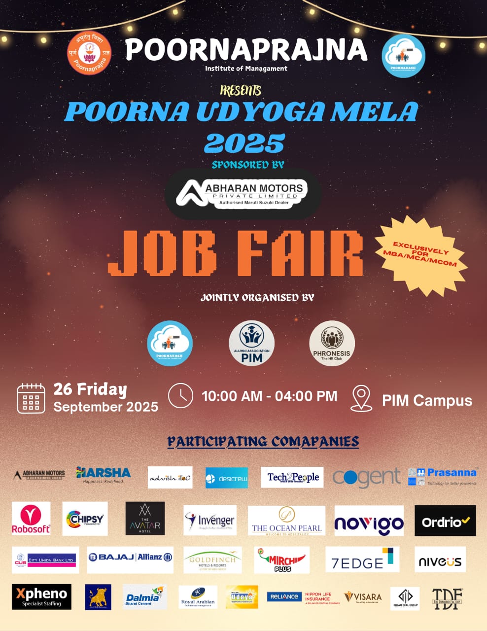 ಉಡುಪಿ: ನಗರದ ಪೂರ್ಣಪ್ರಜ್ನ ಇನ್ಸ್ಟಿಟ್ಯೂಟ್ ಆಫ್ ಮ್ಯಾನೇಜ್ಮೆಂಟ್ನ ಕ್ಯಾಂಪಸ್ನಲ್ಲಿ ಸೆ.26ರಂದು ಬೆಳಗ್ಗೆ 10 ರಿಂದ ಸಂಜೆ 4 ರವರೆಗೆ ಪೂರ್ಣ ಉದ್ಯೋಗ ಮೇಳ 2025 – ಉದ್ಯೋಗ ಮೇಳ ಆಯೋಜಿಸಲಾಗಿದೆ.