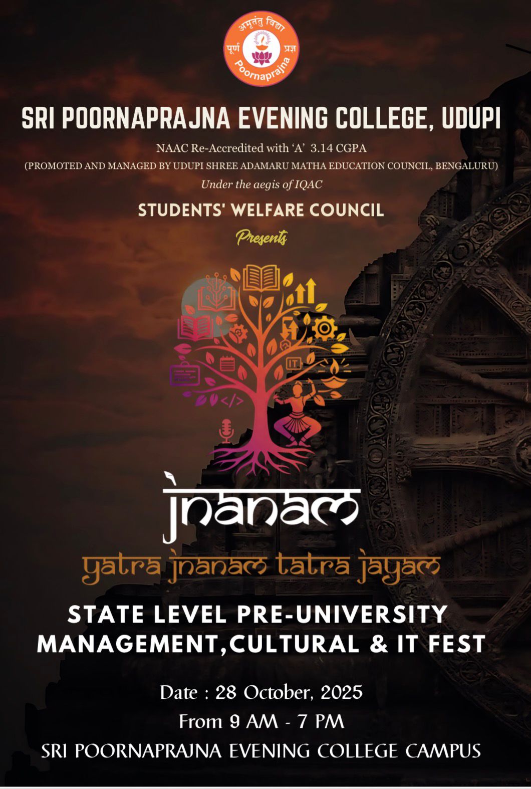 ಉಡುಪಿ: ಶ್ರೀ ಪೂರ್ಣಪ್ರಜ್ಞ ಸಂಧ್ಯಾ ಕಾಲೇಜು, ಉಡುಪಿ ಇದರ ವತಿಯಿಂದ ದಿನಾಂಕ 28-10-2025ನೇ ಮಂಗಳವಾರದಂದು ಉಡುಪಿ, ಮಂಗಳೂರು, ಕಾರ್ಕಳ ಹಾಗೂ ಕುಂದಾಪುರದ ಪದವಿಪೂರ್ವ ವಿದ್ಯಾರ್ಥಿಗಳಿಗಾಗಿ ಜ್ಞಾನಂ – 2025 ಎಂಬ ವಿಭಿನ್ನ ಸ್ಪರ್ಧಾ ಕಾರ್ಯಕ್ರಮ ಒಂದನ್ನು ಆಯೋಜಿಸಲಾಗಿದೆ.