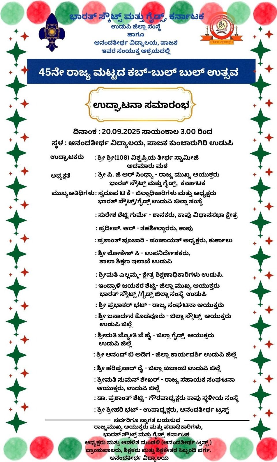 ಉಡುಪಿ: ಪಾಜಕ ಕುಂಜಾರುಗಿರಿಯ ಆನಂದತೀರ್ಥ ವಿದ್ಯಾಲಯದಲ್ಲಿ ರಾಜ್ಯಮಟ್ಟದ ಕಬ್-ಬುಲ್ ಬುಲ್ ಉತ್ಸವವು ಸೆ. 20 ರಿಂದ 23ರವರೆಗೆ ನಡೆಯಲಿದೆ.