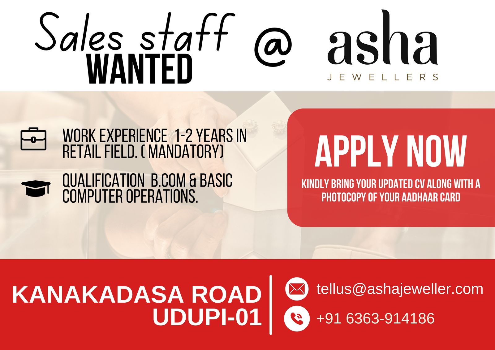 ಉಡುಪಿ:ಉಡುಪಿಯ ಆಶಾ ಜ್ಯುವೆಲ್ಲರ್ಸ್ ನಲ್ಲಿ ಸೇಲ್ಸ್ ಸ್ಟಾಫ್ ಹುದ್ದೆಗೆ ನೇಮಕಾತಿ ನಡೆಯಲಿದೆ.