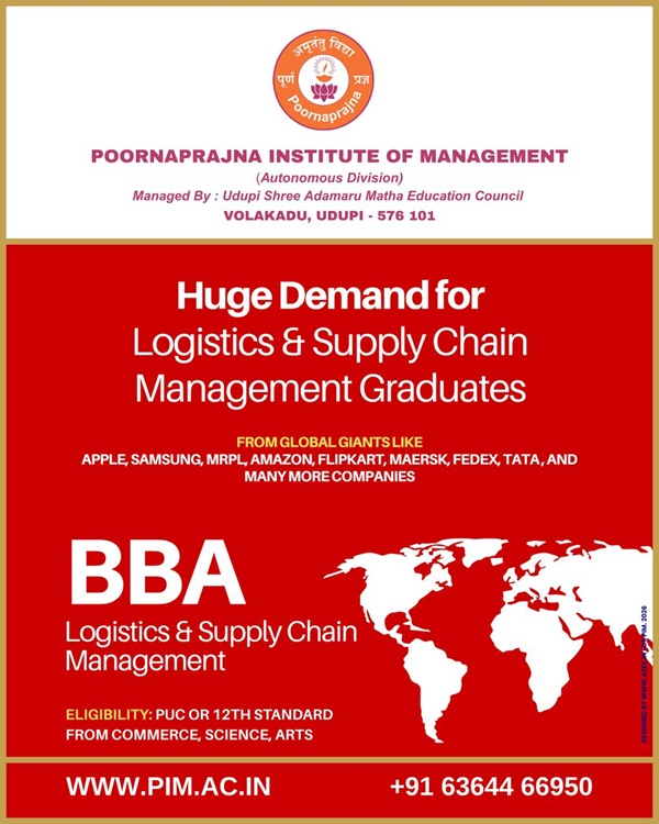 ಉಡುಪಿ: ಪೂರ್ಣಪ್ರಜ್ಞ ಇನ್ಸ್ಟಿಟ್ಯೂಟ್ ಆಫ್ ಮ್ಯಾನೇಜ್ಮೆಂಟ್ (PIM), ಉಡುಪಿ ಸಂಸ್ಥೆಯು 12ನೇ ತರಗತಿ ಉತ್ತೀರ್ಣ ವಿದ್ಯಾರ್ಥಿಗಳಿಗೆ ಬಿಬಿಎ (ಲಾಜಿಸ್ಟಿಕ್ಸ್ & ಸಪ್ಲೈ ಚೈನ್ ಮ್ಯಾನೇಜ್ಮೆಂಟ್) ಕೋರ್ಸ್‌ಗೆ ಪ್ರವೇಶಕ್ಕಾಗಿ ಆಹ್ವಾನ ನೀಡಿದೆ.